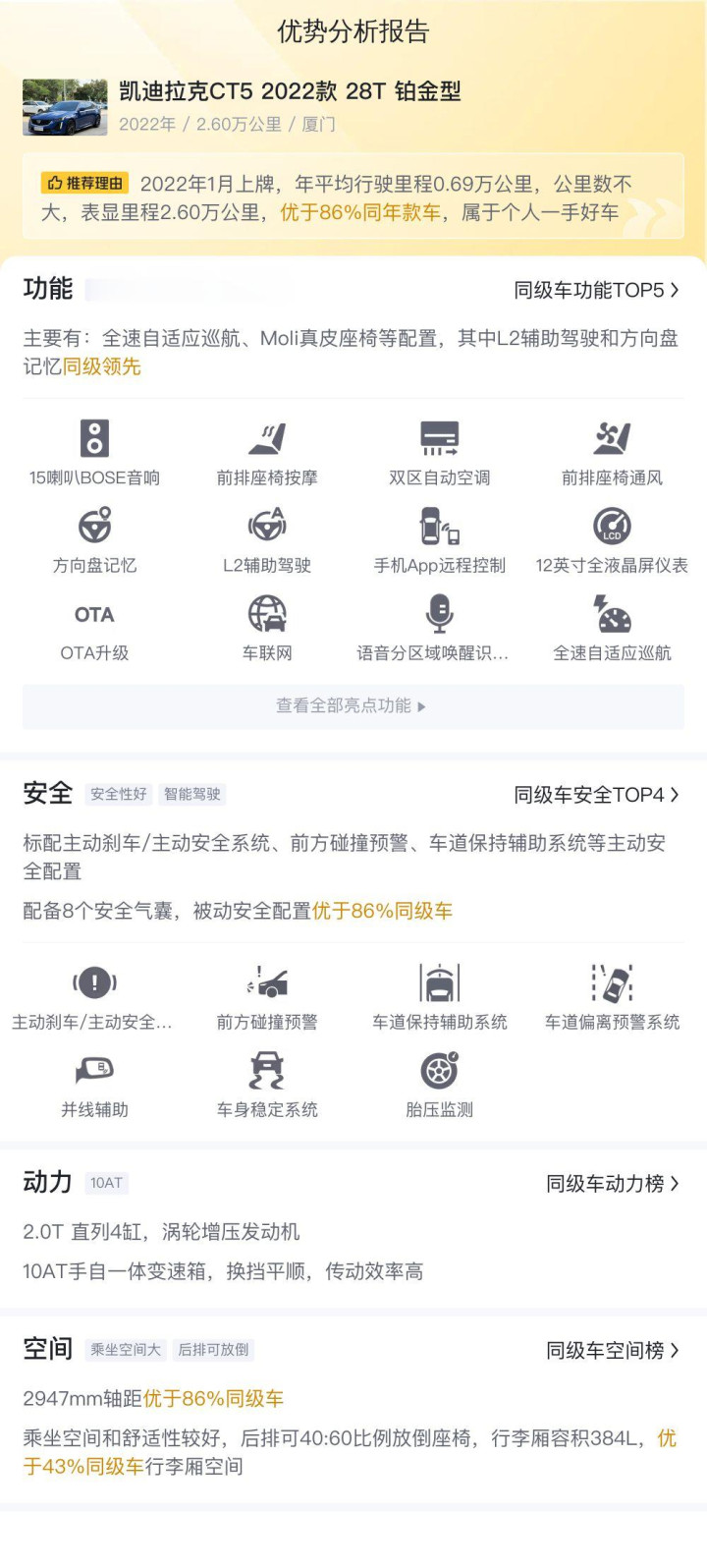 综上所述的新车含税价、用车成本、市场行情、优势分析、同款比价等数据仅供参考。在配置部分,因为二手车非标品,车辆可能会存在配置改装的情况,具体车况信息需要线下结合车辆实际情况进行综合参考。